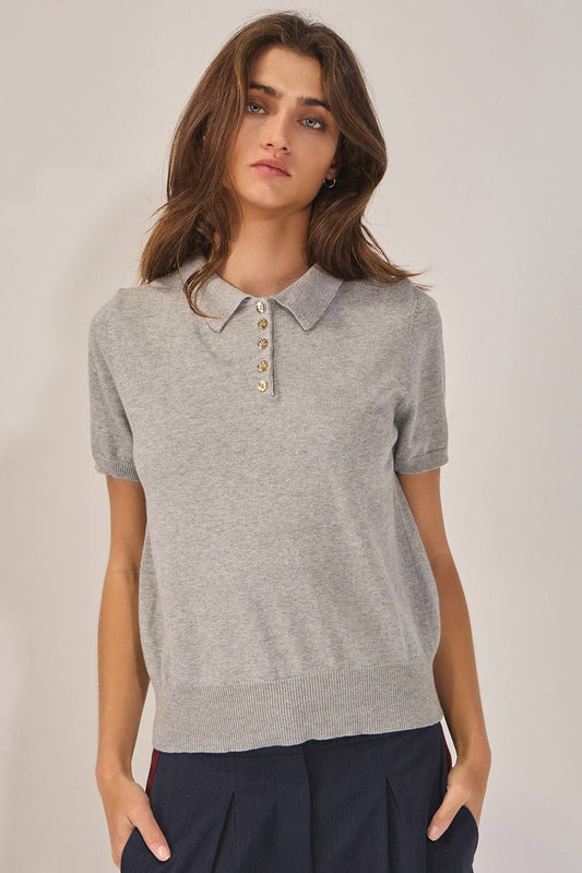 Plain Knit Jersey Polo Shirt With Gold Buttons: GREY