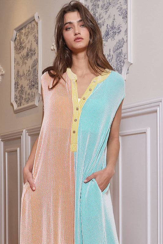 ColorBlock Wide Leg Button-up Loose Fit Ribbed Jumpsuit