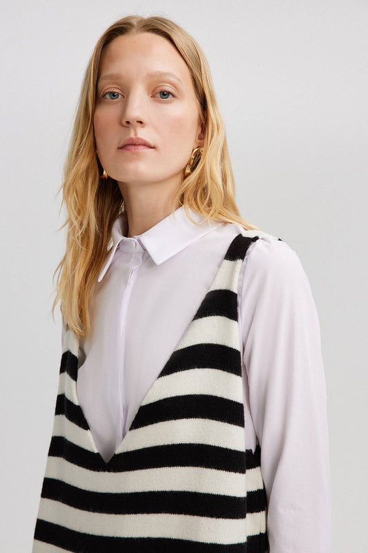 V Neck Striped Gilet Dress - Standard Fit: Black
