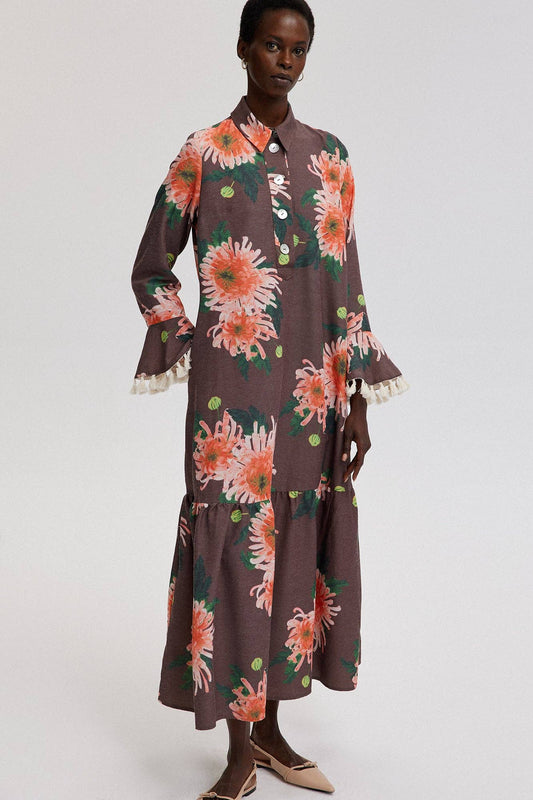 FLORAL PATTERNED NATURAL TEXTURED DRESS: Brown