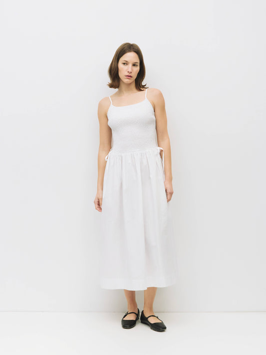 The Jenni Dress | Smocked Midi Dress with Side Ties: WHITE