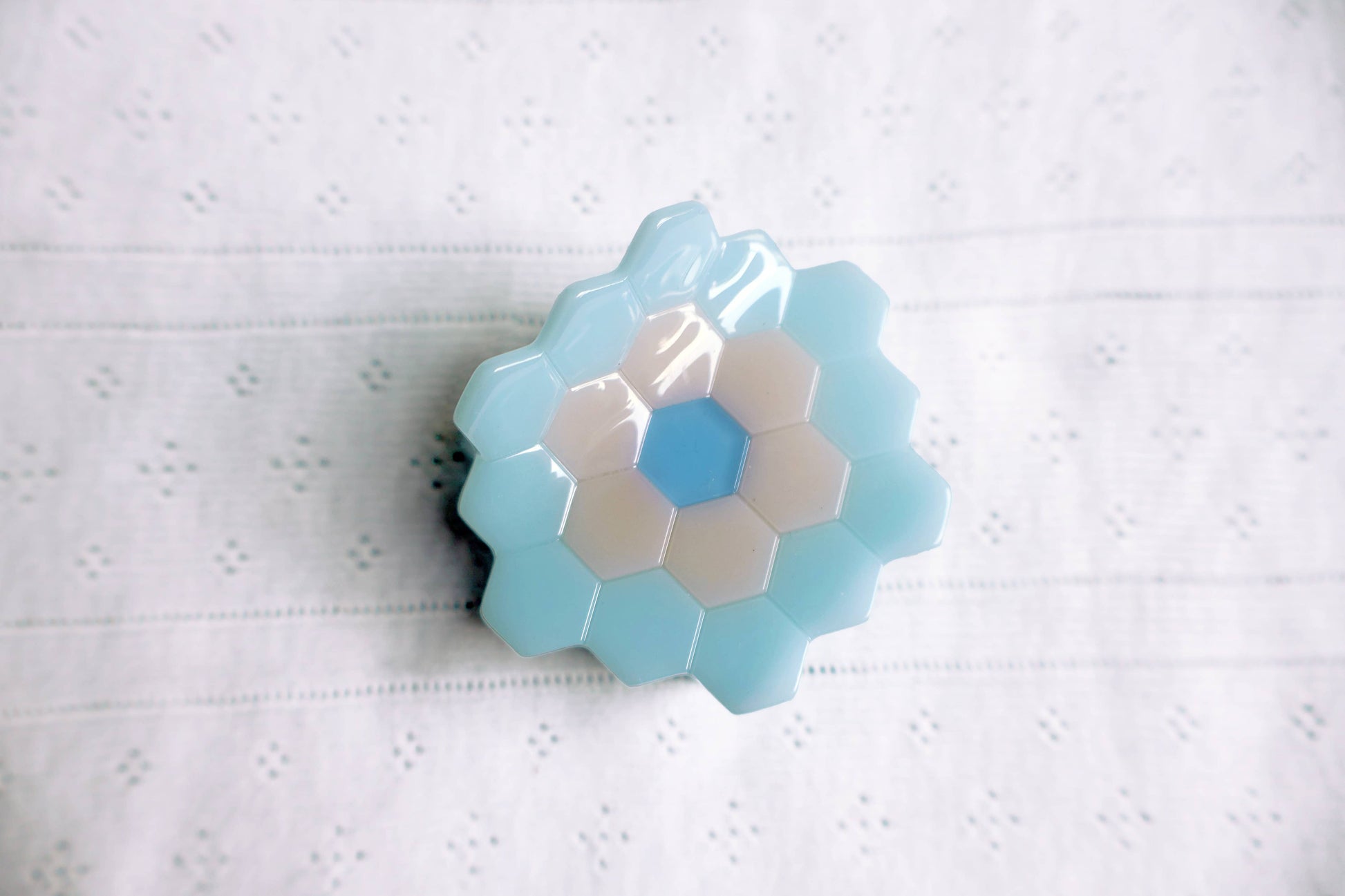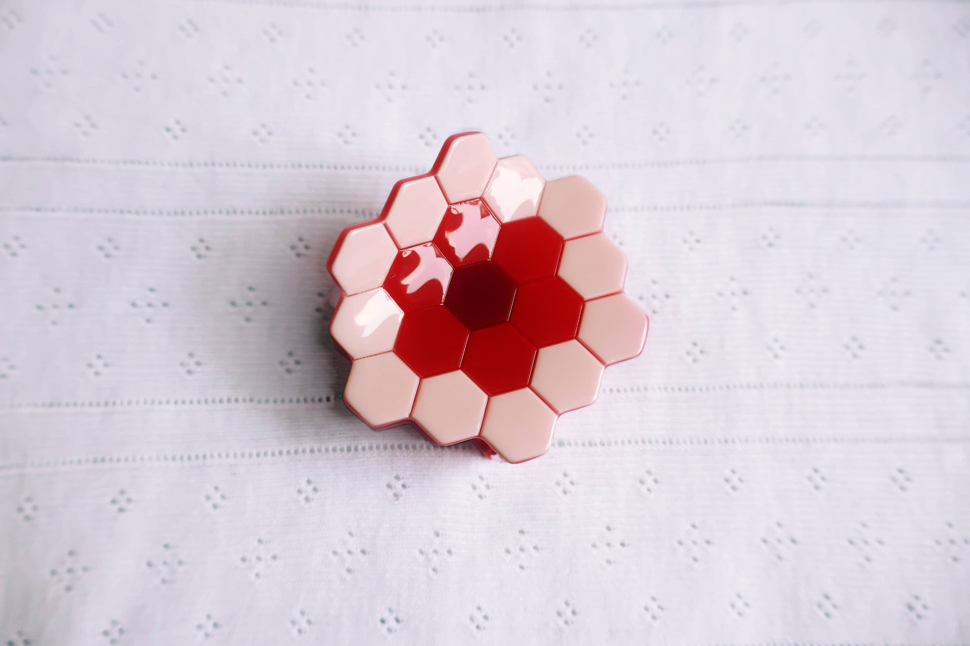 Inspired by the beloved hexagon quilt pattern, also called Grandmother's Garden or English Paper Piecing, the Hexie Claw is a mid-sized, multicolored claw with a traditional vibe.