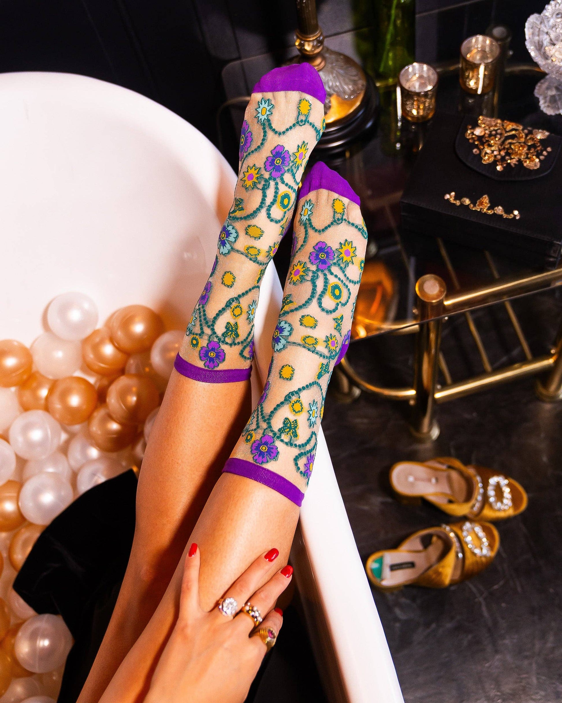 Shimmer sheer has entered the chat. Introducing our first-ever colored shimmer sheer sock – your ultimate statement accessory for every fête, photoshoot, and fashion moment. Crafted with a sheer base that glimmers with a gold metallic thread, this sock features an enchanting garden of jeweled florals in bold purple, teal, and citron, outlined with intricate vine-like embroidery. The vivid purple cuff, heel, and toe pop against the golden shimmer, creating a richly regal effect that’s impossible to ignore Whether you're draped in velvet or soaking in glamour, this sock takes center stage.