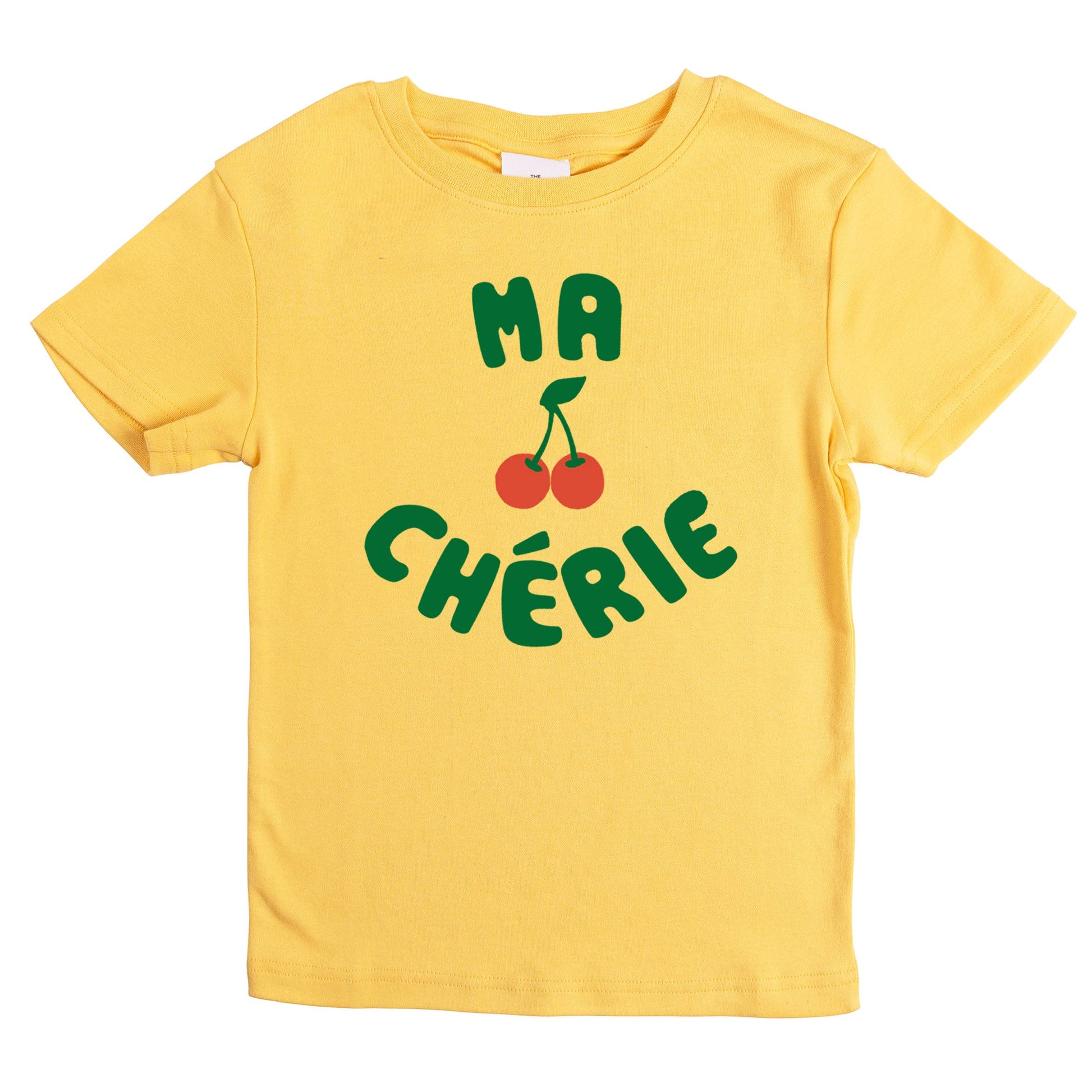 How cute is this baby girl and kids graphic shirt featuring the endearing phrase "ma cherie" accompanied by a charming image of cherries nestled between the words.