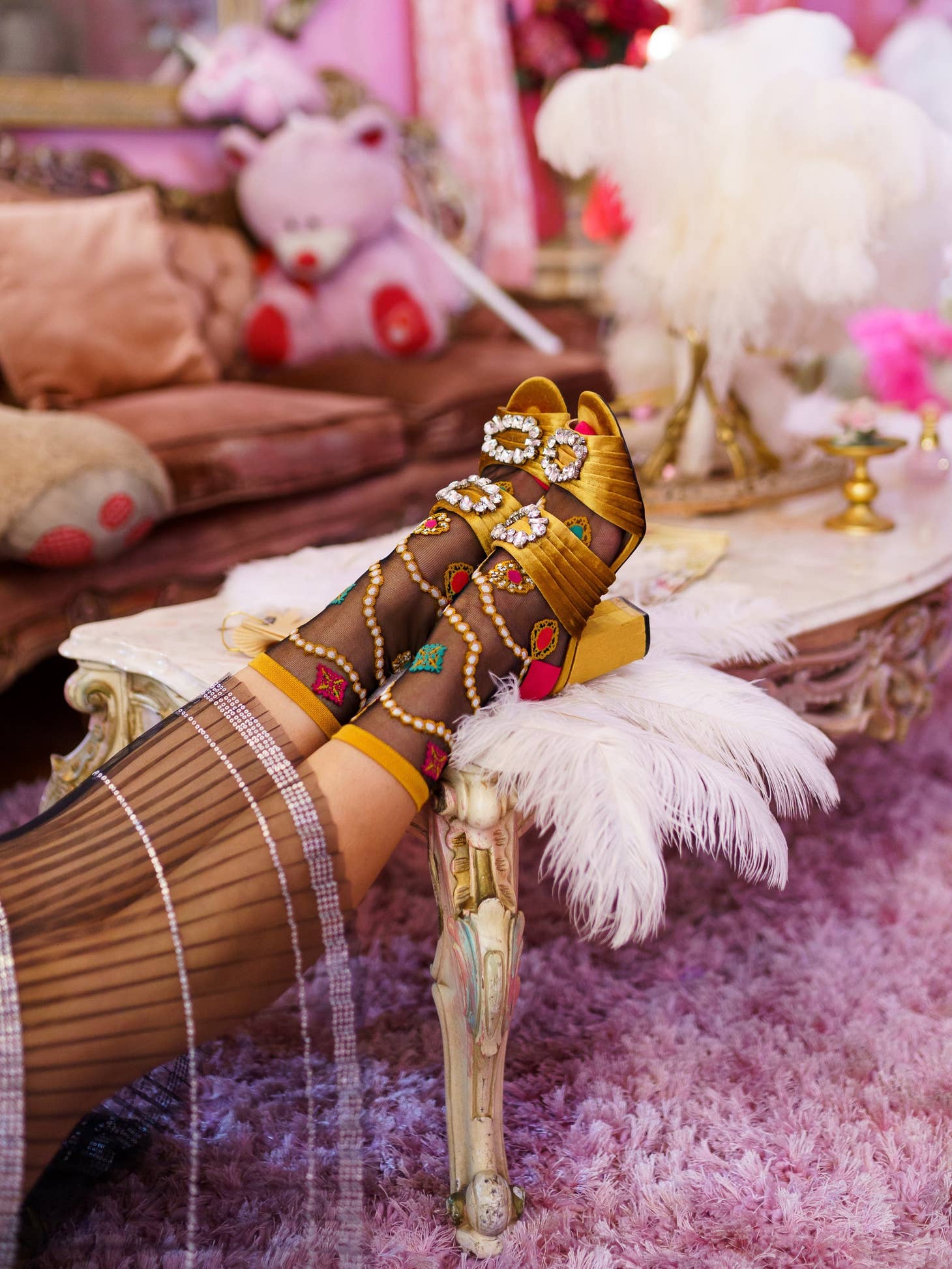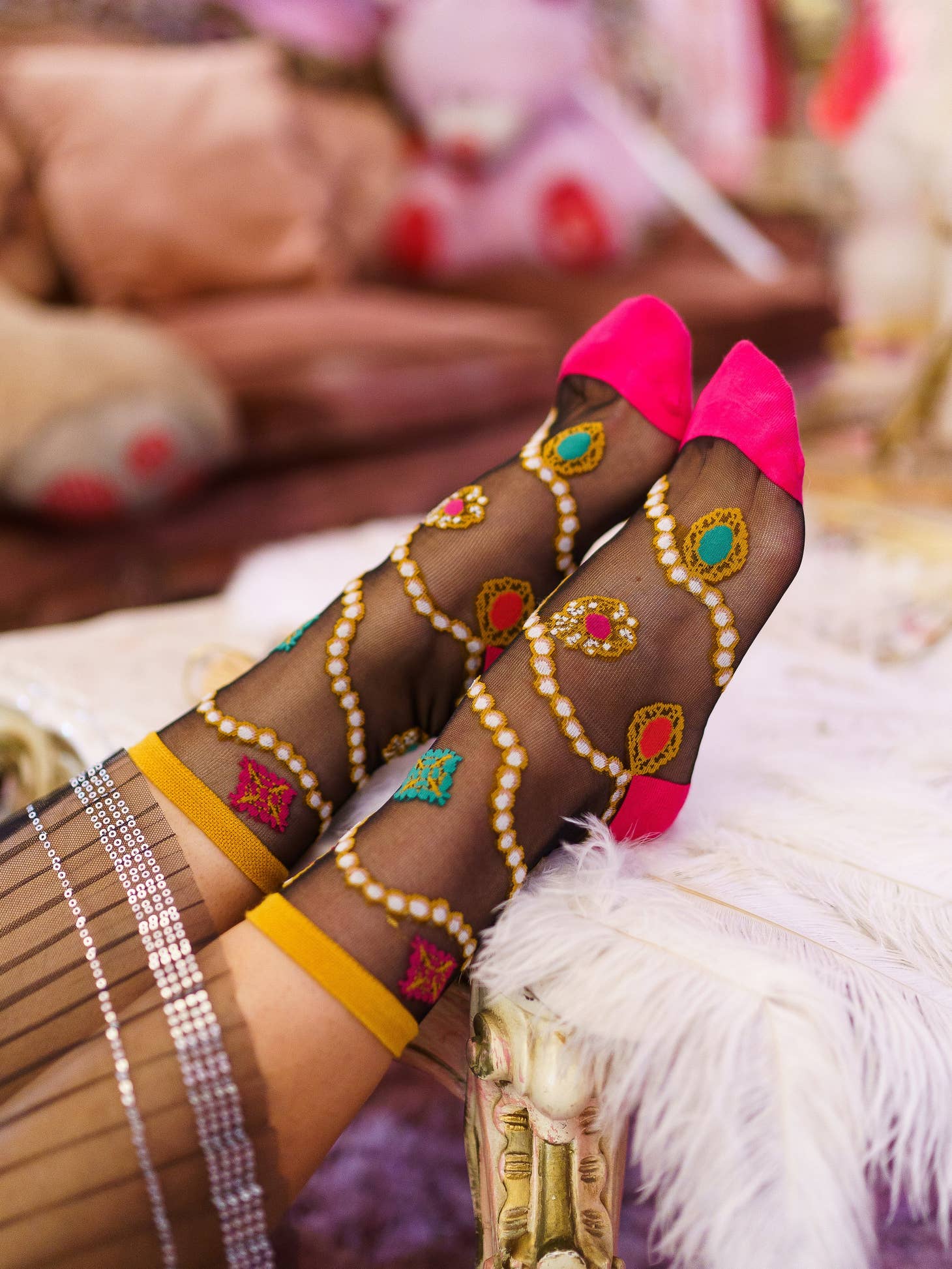 Adorn your feet with luxe pearls and vintage jewels for the holiday season. Set against a black sheer fabric, this is your go-to fancy ankle sock for pairing with dressy heels for an unforgettable holiday look.