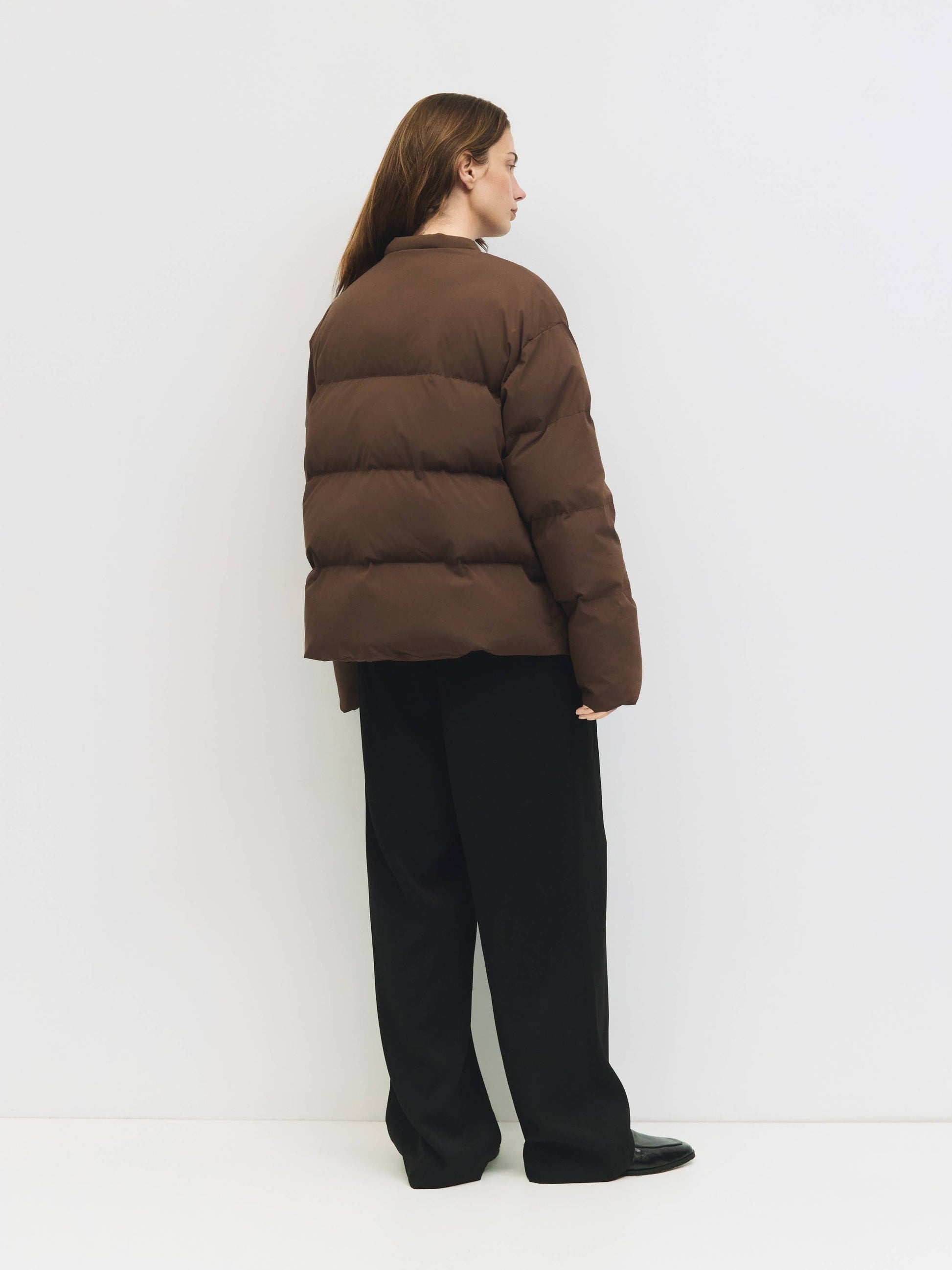 The Mila Jacket is a fully lined puffer style with quilted padding for added warmth. Designed with an oversized fit, it features a crewneck with tie detail, a two-way front zip closure, and long sleeves. A functional outer layer with a soft, sculptural silhouette.