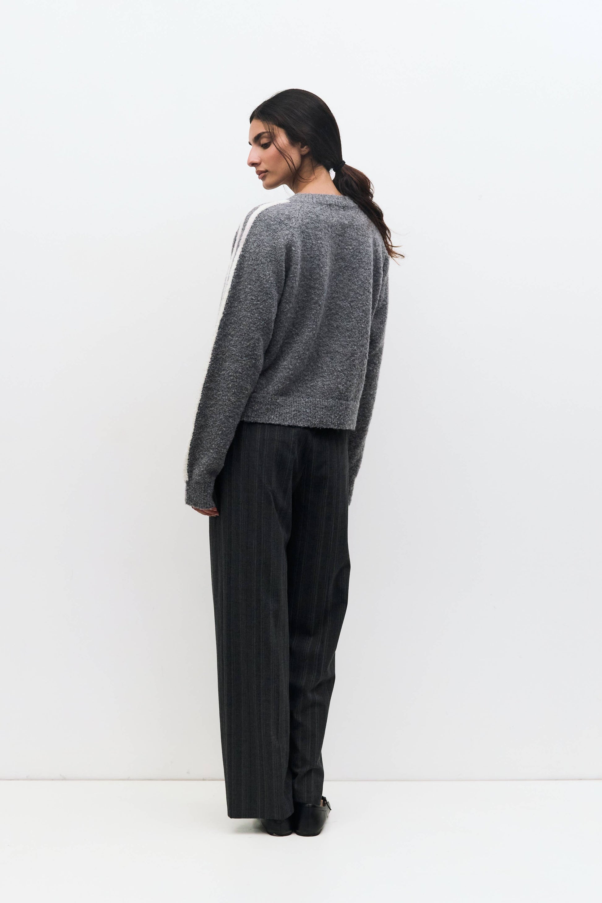The Reba Sweater is a zip-up jacket knit from midweight bouclé, offering subtle texture and warmth. Featuring a ribbed crewneck, contrast double stripes on the sleeves, and a relaxed fit, it’s perfect for easy layering.